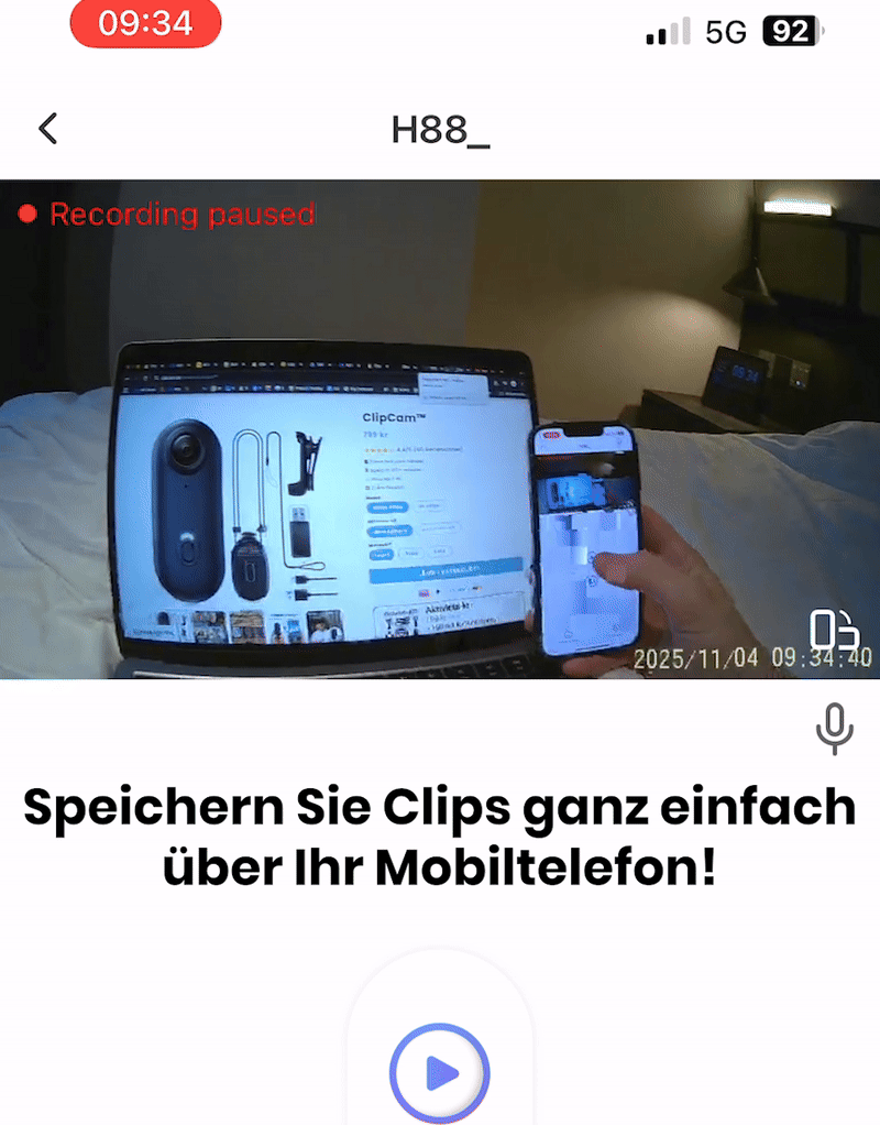 Mit ClipCam können Sie freihändig aus Ihrem eigenen Winkel in 4K/HD aufnehmen.